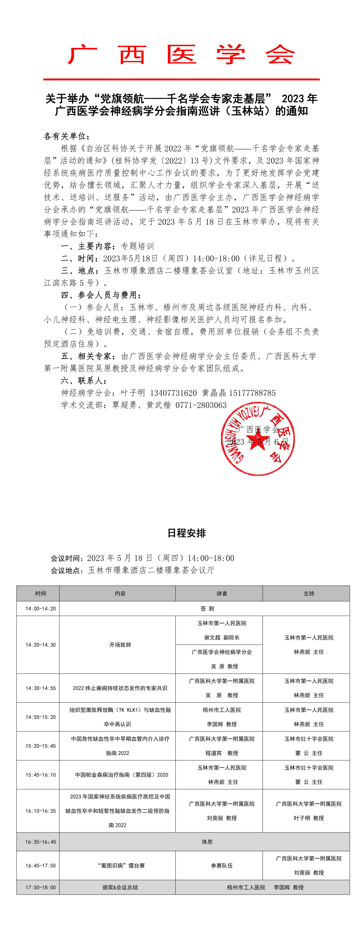 关于举办“党旗领航——千名学会专家走基层” 2023年广西医学会神经病学分会指南巡讲(玉林站)的通知