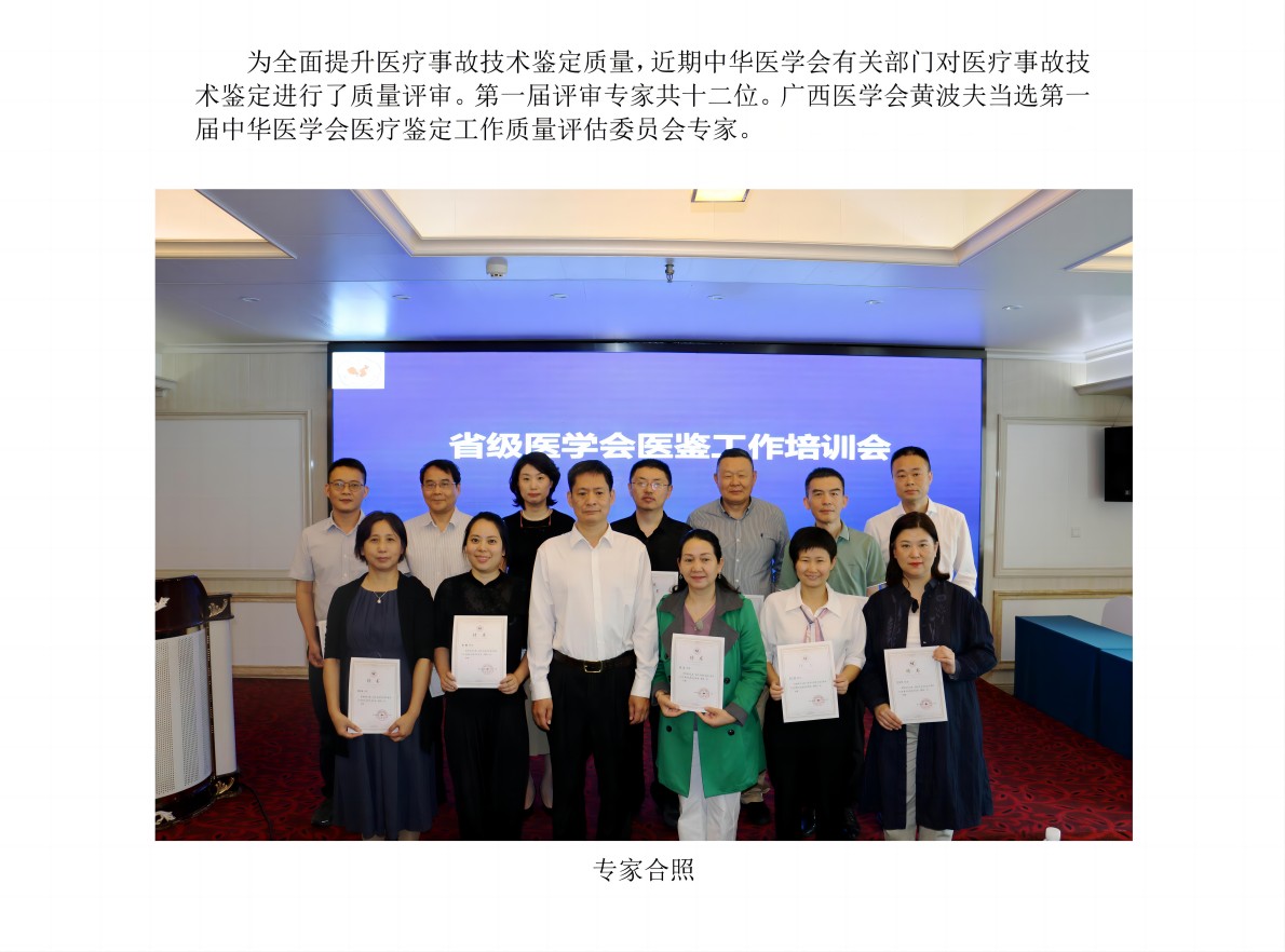 广西医学会黄波夫当选第一届中华医学会医疗鉴定工作质量评估委员会专家