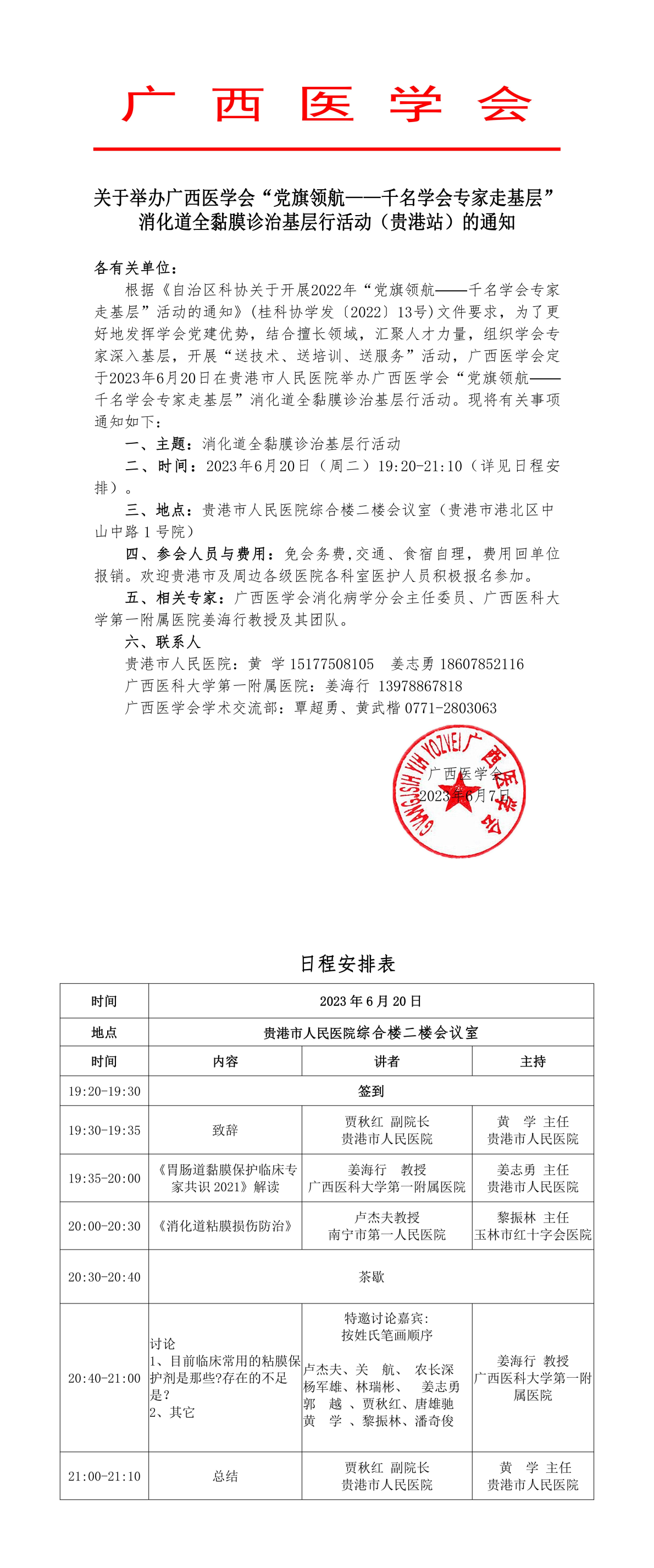 关于举办广西医学会“党旗领航——千名学会专家走基层” 消化道全黏膜诊治基层行活动(贵港站)的通知