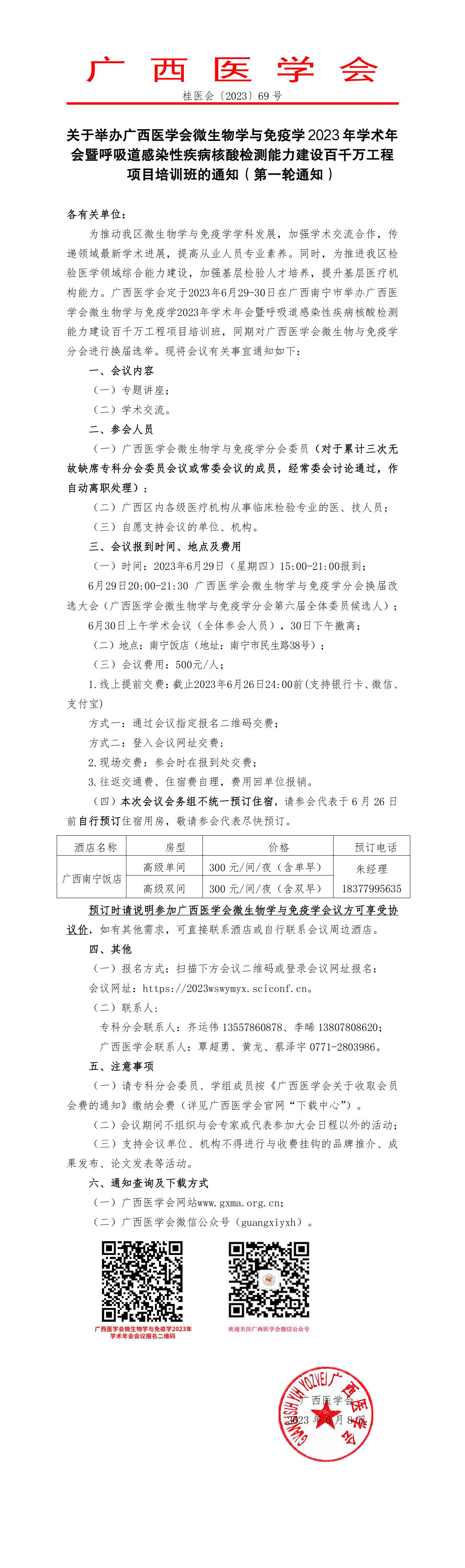 关于举办广西医学会微生物学与免疫学2023年学术年会暨呼吸道感染性疾病核酸检测能力建设百千万工程项目培训班的通知(第一轮通知)