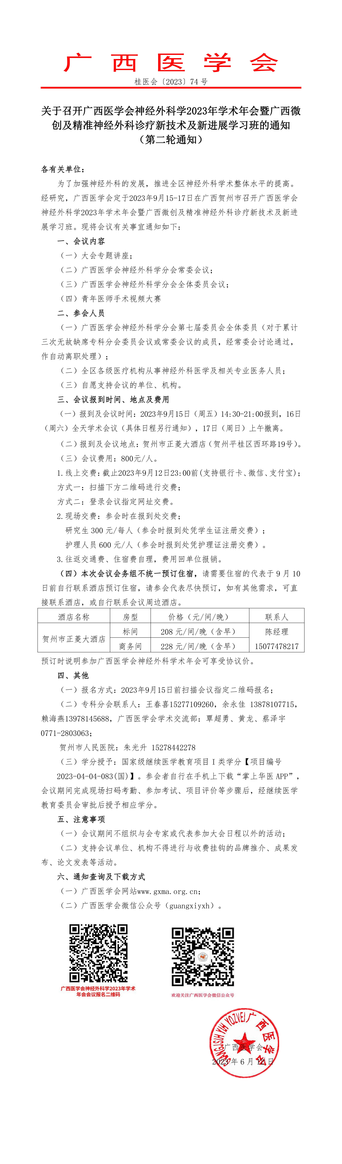 关于召开广西医学会神经外科学2023年学术年会暨广西微创及精准神经外科诊疗新技术及新进展学习班的通知 (第二轮通知)