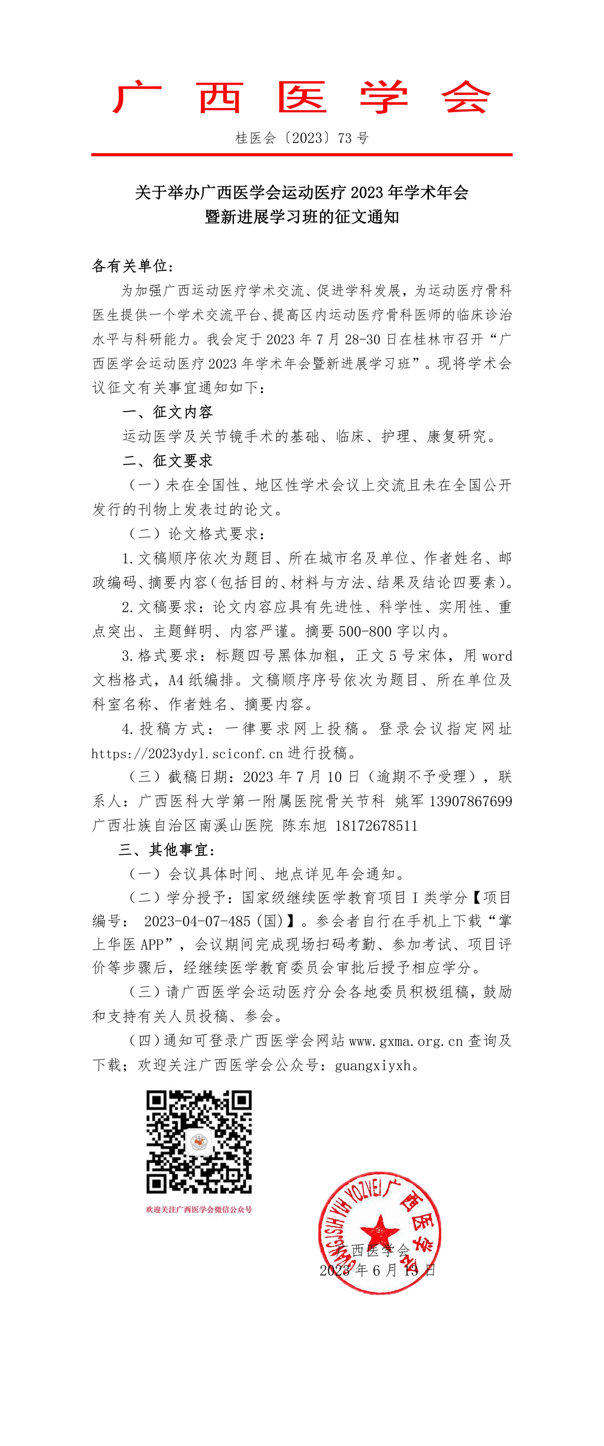 关于举办广西医学会运动医疗2023年学术年会暨新进展学习班的征文通知