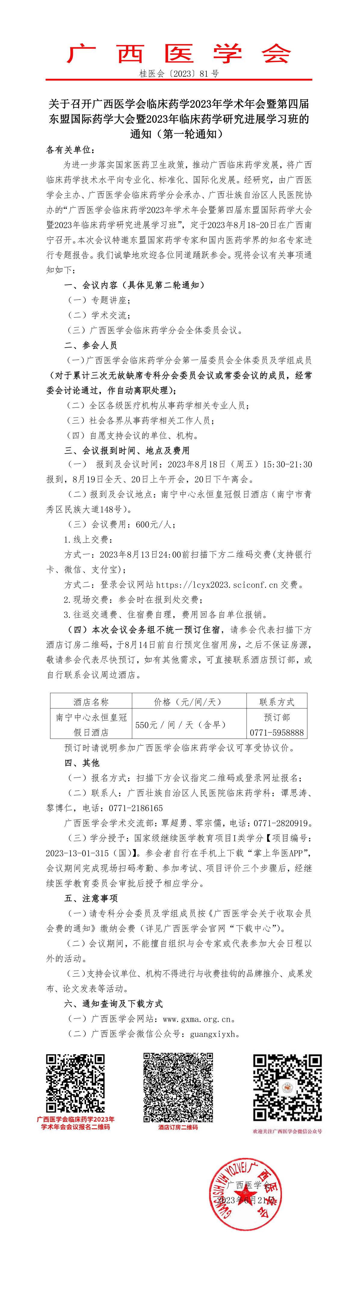 关于召开广西医学会临床药学2023年学术年会暨第四届东盟国际药学大会暨2023年临床药学研究进展学习班的通知(第一轮通知)