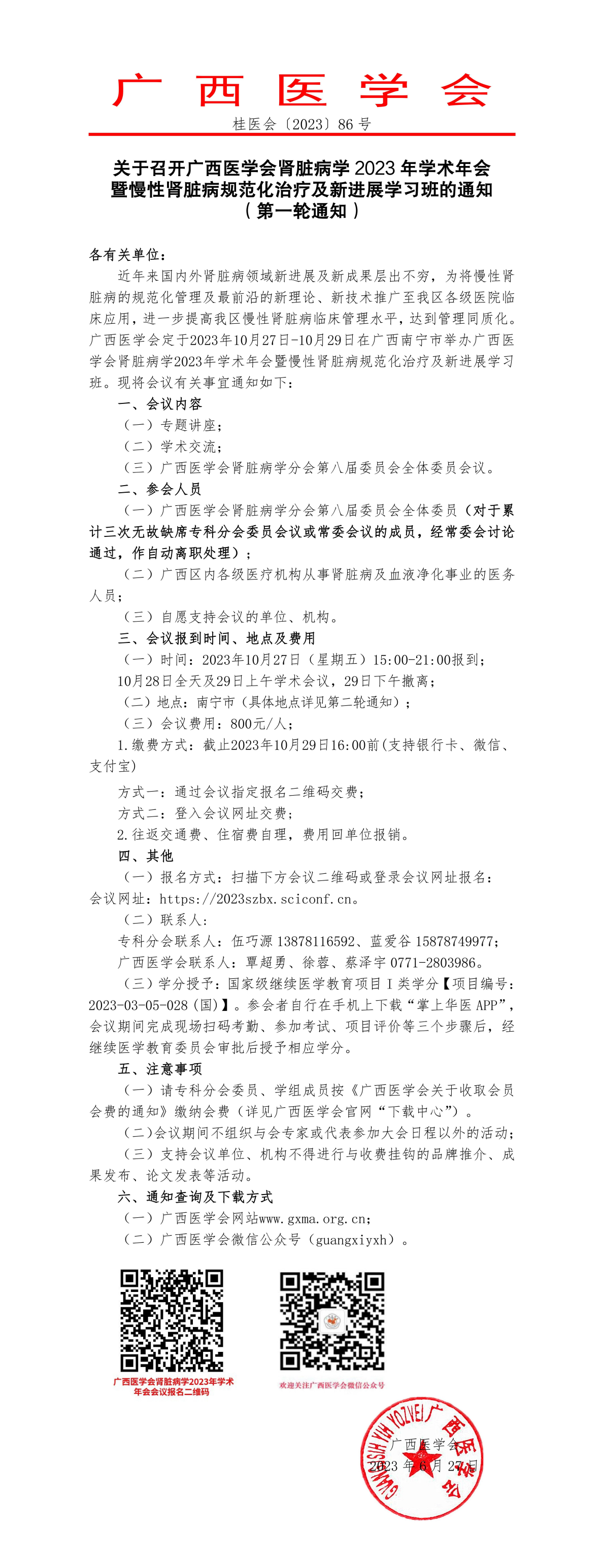 关于召开广西医学会肾脏病学2023年学术年会暨慢性肾脏病规范化治疗及新进展学习班的通知(第一轮通知)