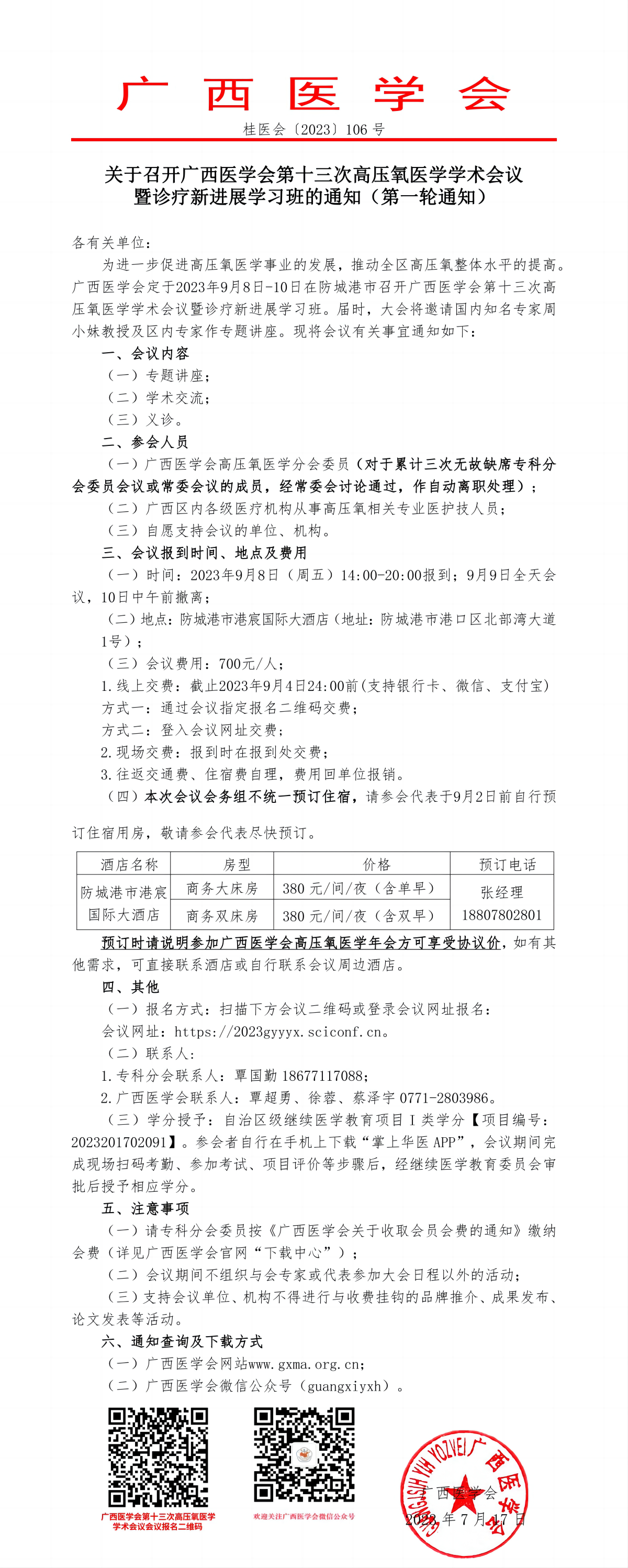 关于召开广西医学会第十三次高压氧医学学术会议暨诊疗新进展学习班的通知(第一轮通知)